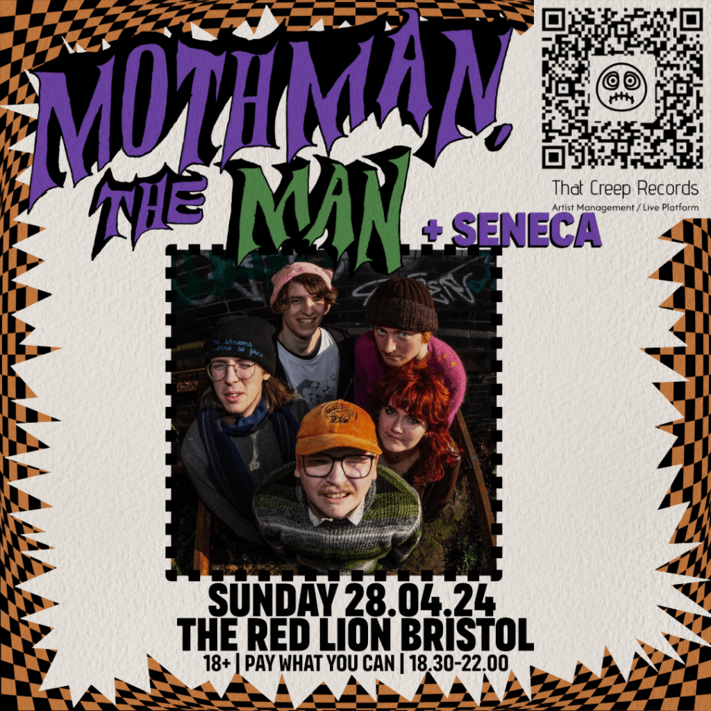 https://www.wegottickets.com/event/617515 and https://www.headfirstbristol.co.uk/whats-on/the-red-lion/sun-28-apr-mothman-the-man-seneca-107255#e107255